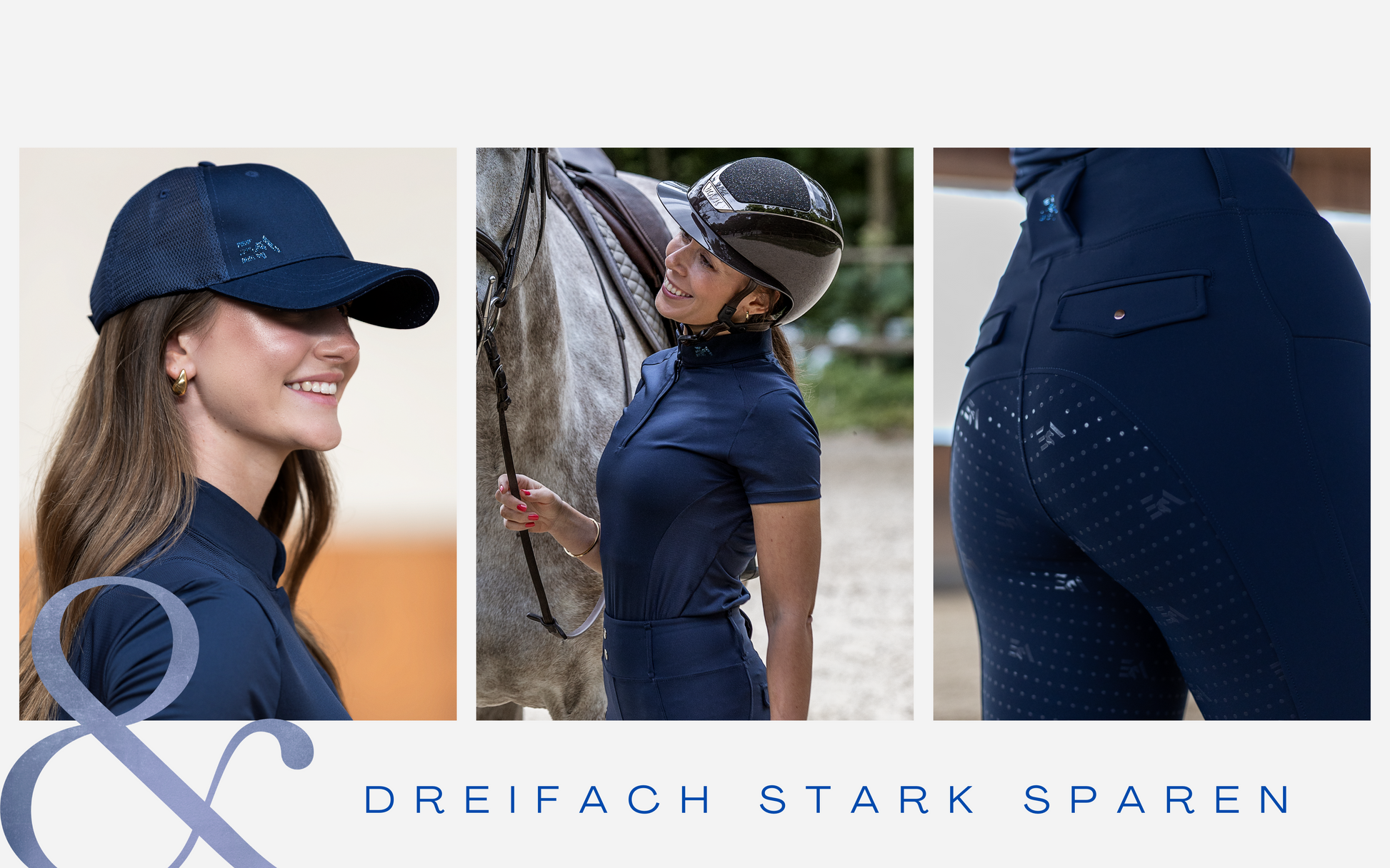 Das “Endless Navy Shine Trio” von EquiAttire umfasst den Baselayer Short Sleeve - navy und das Herzstück, die All-inclusive Reitleggings - navy, sowie die elegante EquiAttire Cap - navy.